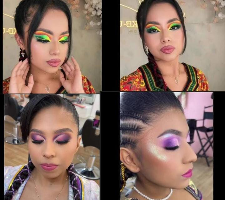 Aplicar sombras de transición en tonos vivos o cálidos que combinen con el traje (rosado, fucsia, lila, dorado)